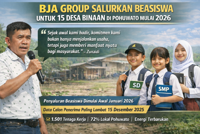 POHUWATO, BICARAA.COM — BJA Group memastikan mulai tahun 2026 akan menyalurkan program beasiswa pendidikan bagi warga di 15 desa binaan di Kabupaten Pohuwato.