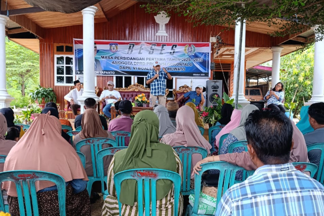 POHUWATO, BICARAA.COM — Ketua Komisi II DPRD Provinsi Gorontalo, Mikson Yapanto, dari Daerah Pemilihan VI Pohuwato–Boalemo, melaksanakan Reses Masa Persidangan Pertama Tahun Sidang 2025–2026 di Desa Wanggarasi Timur, Kecamatan Wanggarasi, Kabupaten Pohuwato, Kamis (30/10/2025).