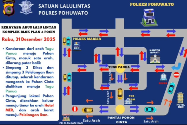 POHUWATO, BICARAA.COM — Polres Pohuwato melalui Satuan Lalu Lintas akan menerapkan rekayasa arus lalu lintas di kawasan kompleks Blok Plan dan Pantai Pohon Cinta pada Rabu, 31 Desember 2025.