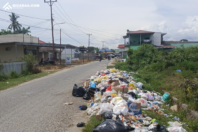 Pantauan bicaraa.com menunjukkan sampah rumah tangga bercampur limbah plastik dibuang sembarangan di bahu jalan dan lahan kosong sekitar terminal.